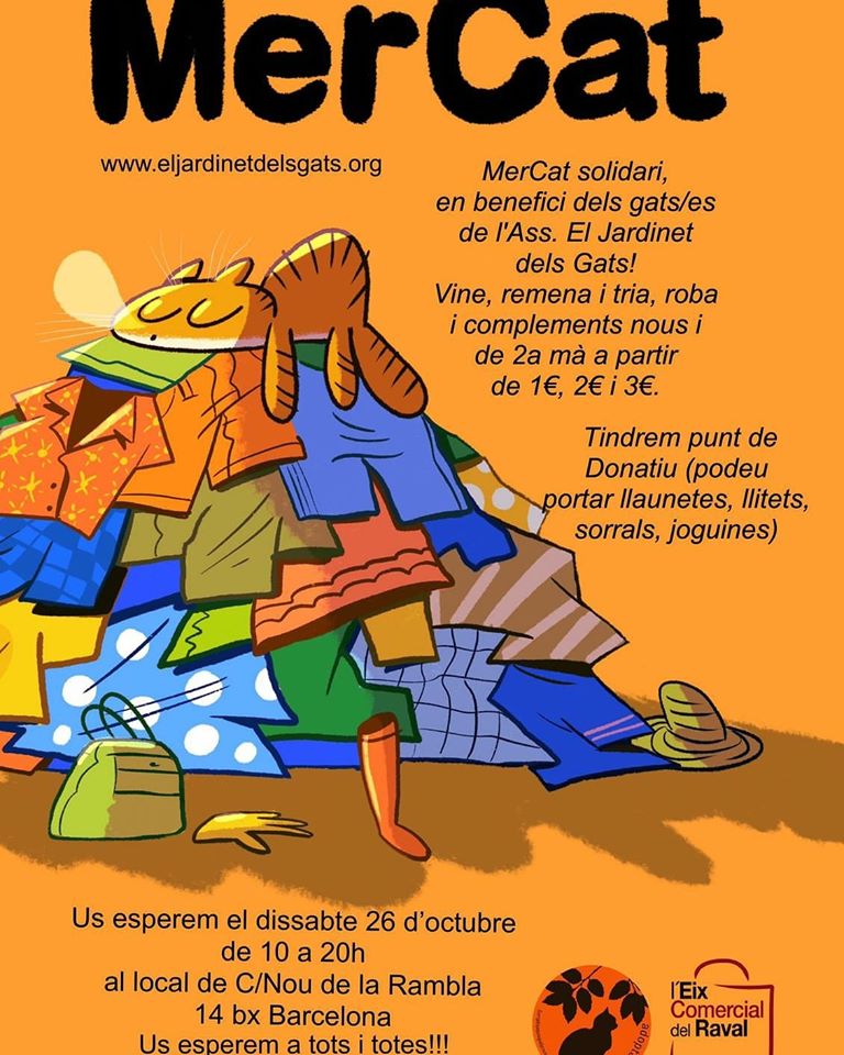 Mercado de ropa y complementos nuevos y usados solidarios, todo los donativos recaudados son para atender a los gatos que rescatamos en Ciutat Vella. De 10a20h en la C/Nou de la Rambla 14 bj 08001 Barcelona enfrente del Palau Güell. Con música ambiente y un montón de cosas chulas! También tendremos Punto de Donativo, puedes traer libros, ropa en buen estado o latas de comida húmeda y juguetes o rascadores para los gatos.