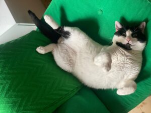 És un gat molt afectuós, li encanten les moxaines i que estiguin per ell, té uns dos anys, li encanta jugar amb un cordill de sabates, és ideal com a gat únic, pero ha viscut amb un altre gat.